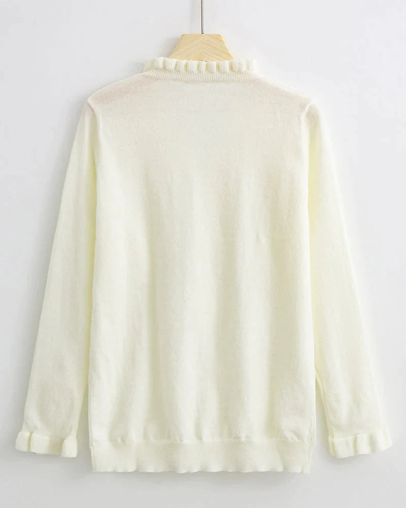 Ontdek de perfecte combinatie van comfort en elegantie met onze stijlvolle trui met ruches. Deze prachtige gebreide trui tilt je stijl naar een hoger niveau met een geraffineerde mix van ruches, een elegante ronde halslijn, gestreepte lange mouwen en een trendy knoopsluiting aan de voorkant.